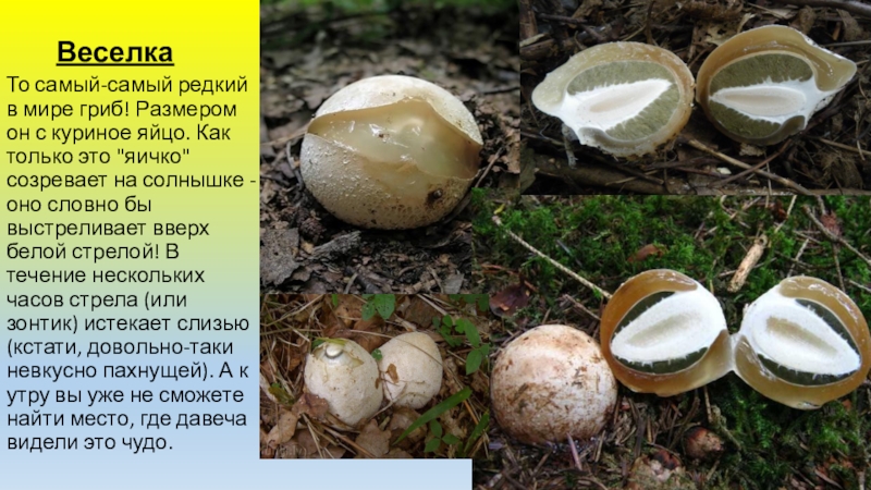 Как только это "яичко" созревает на солнышке - оно словно бы выстреливает вверх белой стрелой! В течение нескольких часов стрела (или зонтик) истекает слизью (кстати, довольно-таки невкусно пахнущей). А к утру вы уже не сможете найти место, где давеча видели это чудо.