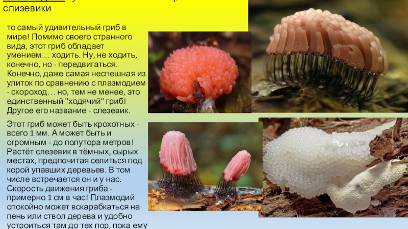 Помимо своего странного вида, этот гриб обладает умением… ходить. Ну, не ходить, конечно, но - передвигаться. Конечно, даже самая неспешная из улиток по сравнению с плазмодием - скороход… но, тем не менее, это единственный "ходячий" гриб! Другое его название - слезевик.