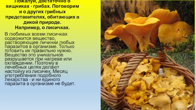 В любимых всеми лисичках содержится вещество, растворяющее личинки любых паразитов в организме. Только готовить их правильно нужно. Вещество это уникальное разрушается при нагреве или охлаждении. Поэтому в лечебных целях делают настойку из лисичек. Месяц употребления подобного лекарства - и ни единого паразита в организме не будет.