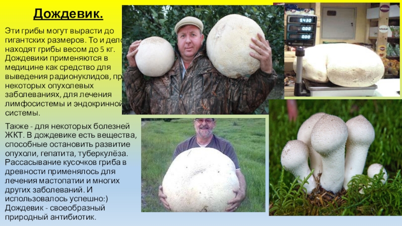 грибы весом до 5 кг. Дождевики применяются в медицине как средство для выведения радионуклидов, при некоторых опухолевых заболеваниях, для лечения лимфосистемы и эндокринной системы.