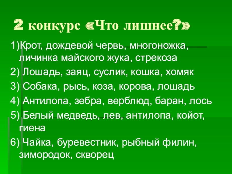 1)Крот, дождевой червь, многоножка, личинка майского жука, стрекоза
