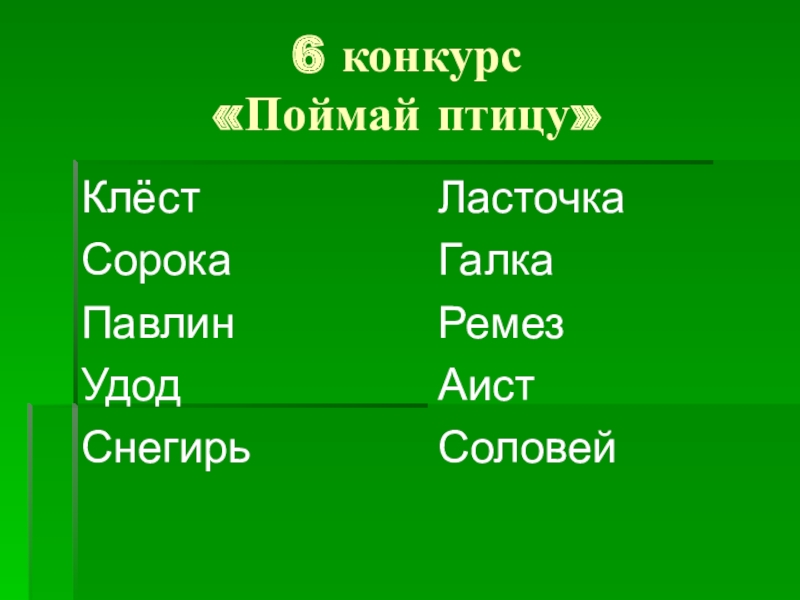 6) Чайка, буревестник, рыбный филин, зимородок, скворец