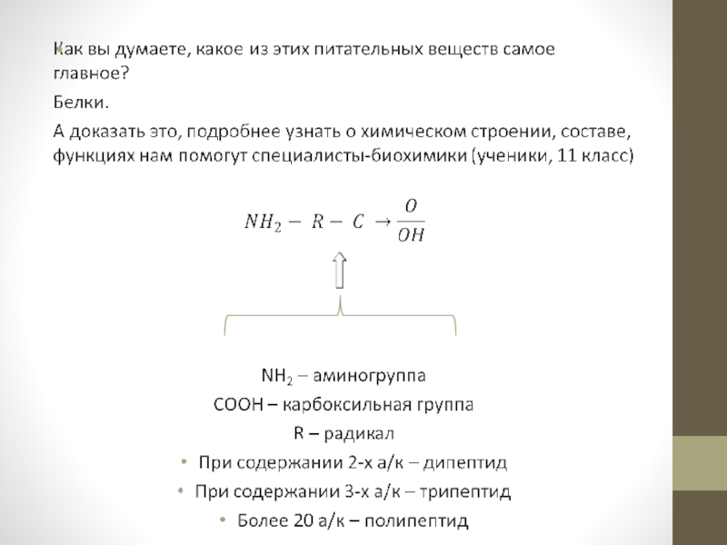 белки, жиры, углеводы. Посмотрите ещё раз на химические формулы и сравните их. Что в них общего по химическому составу? (содержат C, H, O). А почему белки выделяют в отдельную группу? (содержат N). На что это указывает?