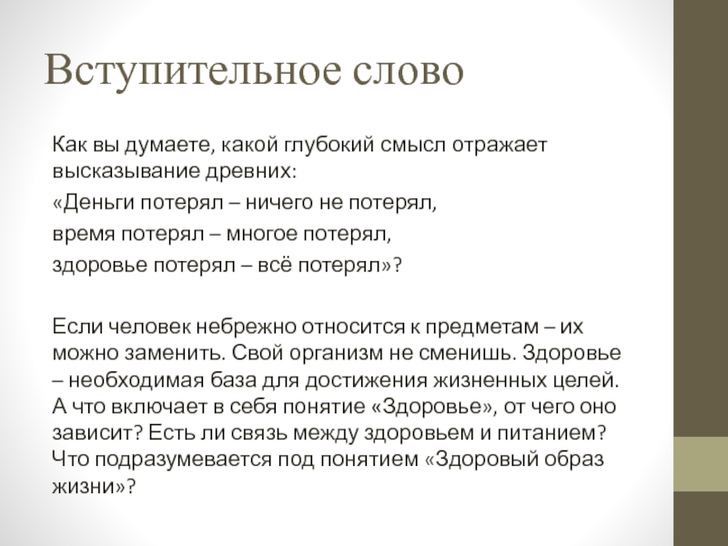 Если человек небрежно относится к предметам – их можно заменить. Свой организм не сменишь. Здоровье – необходимая база для достижения жизненных целей. А что включает в себя понятие «Здоровье», от чего оно зависит? Есть ли связь между здоровьем и питанием? Что подразумевается под понятием «Здоровый образ жизни»?