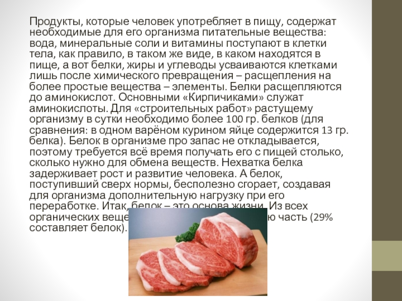 питательные вещества: вода, минеральные соли и витамины поступают в клетки тела, как правило, в таком же виде, в каком находятся в пище, а вот белки, жиры и углеводы усваиваются клетками лишь после химического превращения – расщепления на более простые вещества – элементы. Белки расщепляются до аминокислот. Основными «Кирпичиками» служат аминокислоты. Для «строительных работ» растущему организму в сутки необходимо более 100 гр. белков (для сравнения: в одном варёном курином яйце содержится 13 гр. белка). Белок в организме про запас не откладывается, поэтому требуется всё время получать его с пищей столько, сколько нужно для обмена веществ. Нехватка белка задерживает рост и развитие человека. А белок, поступивший сверх нормы, бесполезно сгорает, создавая для организма дополнительную нагрузку при его переработке. Итак, белок – это основа жизни. Из всех органических веществ тела человека большую часть (29% составляет белок).