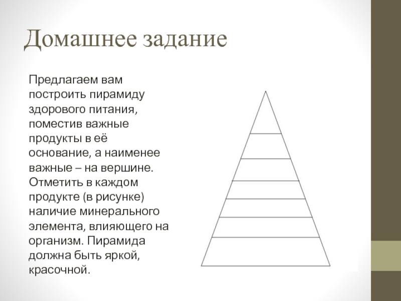 её основание, а наименее важные – на вершине. Отметить в каждом продукте (в рисунке) наличие минерального элемента, влияющего на организм. Пирамида должна быть яркой, красочной.