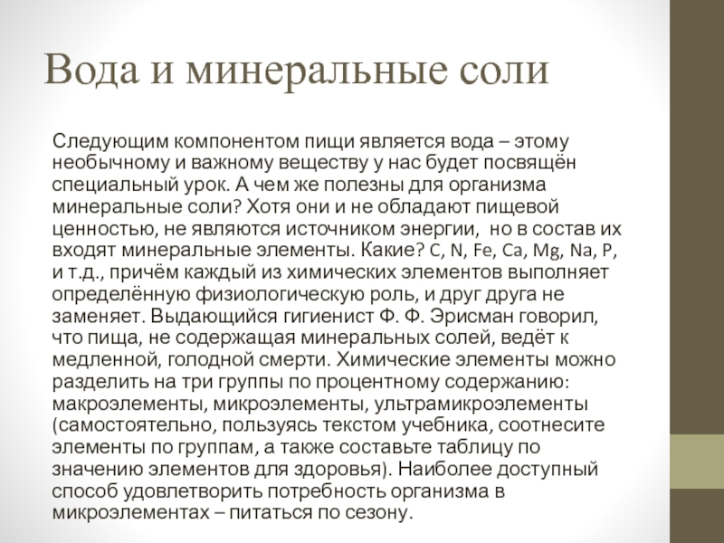 и важному веществу у нас будет посвящён специальный урок. А чем же полезны для организма минеральные соли? Хотя они и не обладают пищевой ценностью, не являются источником энергии, но в состав их входят минеральные элементы. Какие? C, N, Fe, Ca, Mg, Na, P, и т.д., причём каждый из химических элементов выполняет определённую физиологическую роль, и друг друга не заменяет. Выдающийся гигиенист Ф. Ф. Эрисман говорил, что пища, не содержащая минеральных солей, ведёт к медленной, голодной смерти. Химические элементы можно разделить на три группы по процентному содержанию: макроэлементы, микроэлементы, ультрамикроэлементы (самостоятельно, пользуясь текстом учебника, соотнесите элементы по группам, а также составьте таблицу по значению элементов для здоровья). Наиболее доступный способ удовлетворить потребность организма в микроэлементах – питаться по сезону.