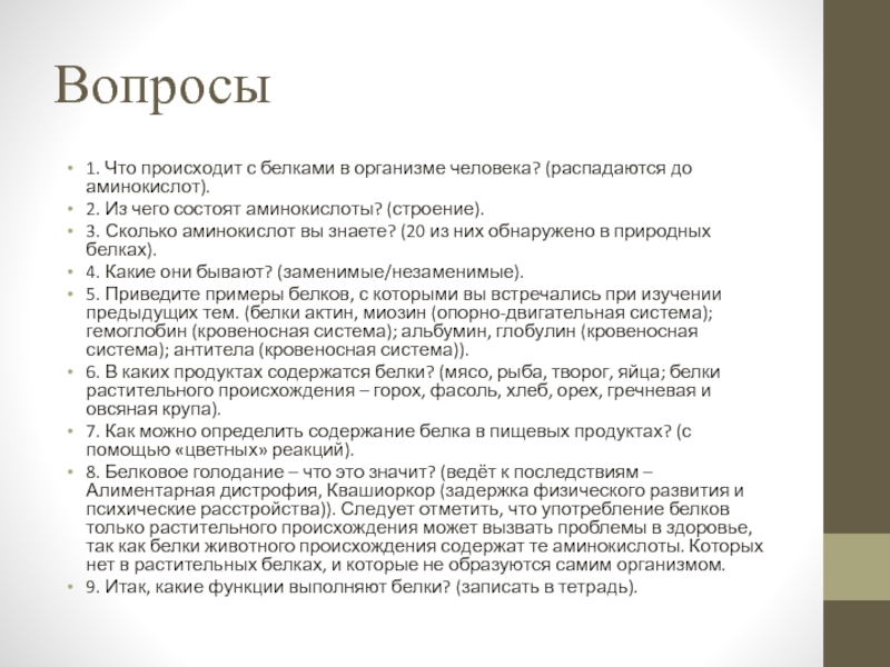 1. Что происходит с белками в организме человека? (распадаются до аминокислот).