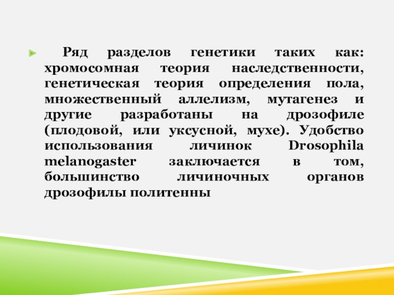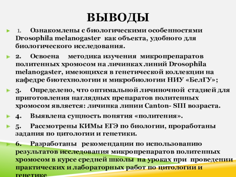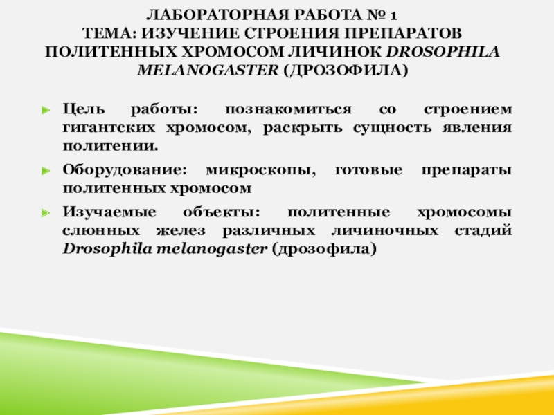 Изучаемые объекты: политенные хромосомы слюнных желез различных личиночных стадий Drosophila melanogaster (дрозофила)