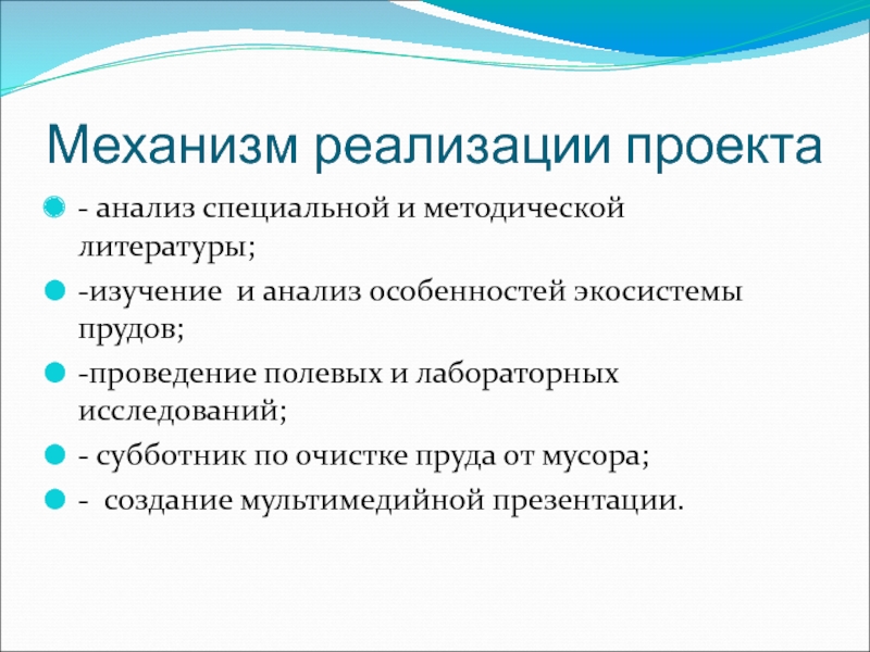 Механизм реализации проекта- анализ специальной и методической  литературы;-изучение и анализ особенностей экосистемы прудов;-проведение полевых и лабораторных