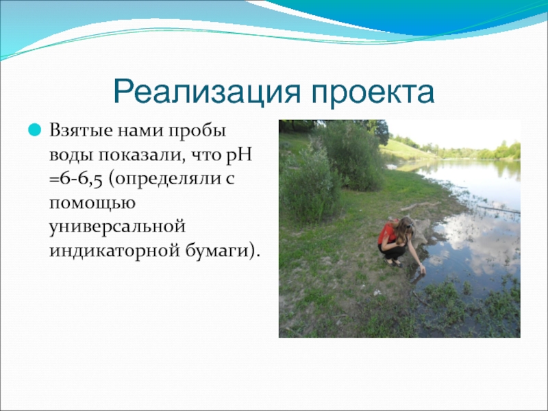 Реализация проектаВзятые нами пробы воды показали, что рН =6-6,5 (определяли с помощью универсальной индикаторной бумаги).