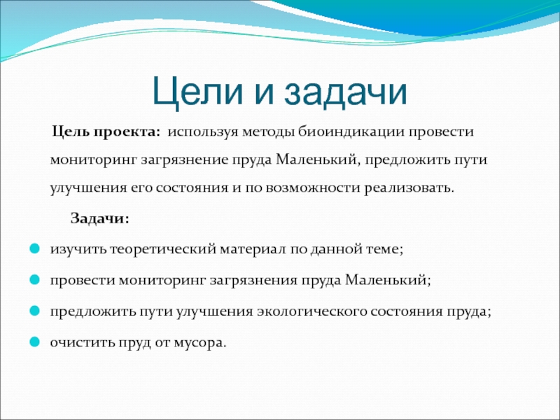 Цели и задачи Цель проекта: используя методы биоиндикации провести мониторинг загрязнение пруда Маленький, предложить пути улучшения его состояния и по возможности реализовать. Задачи:изучить теоретический материал по данной теме; провести