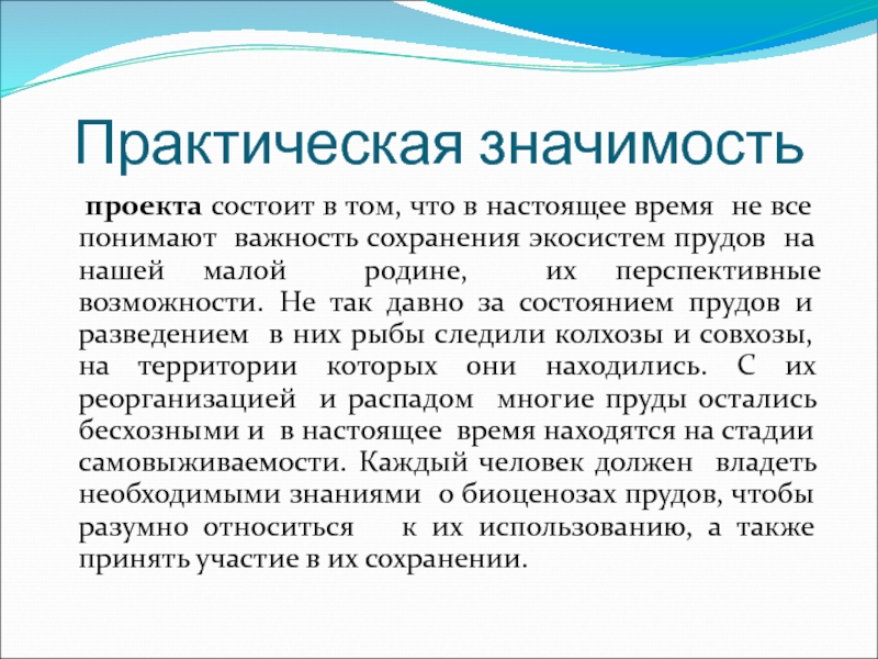 не все понимают важность сохранения экосистем прудов на нашей малой родине, их перспективные возможности. Не так давно за состоянием прудов и разведением в них рыбы следили колхозы и совхозы, на территории которых они находились. С их реорганизацией и распадом многие пруды остались бесхозными и в настоящее время находятся на стадии самовыживаемости. Каждый человек должен владеть необходимыми знаниями о биоценозах прудов, чтобы разумно относиться к их использованию, а также принять участие в их сохранении.