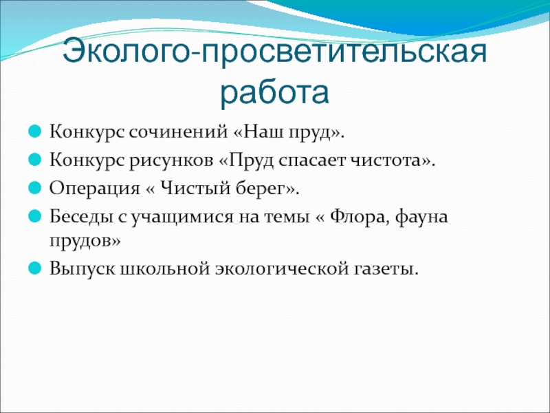 Эколого-просветительская работаКонкурс сочинений «Наш пруд».Конкурс рисунков «Пруд спасает чистота».Операция « Чистый берег».Беседы с учащимися на темы «