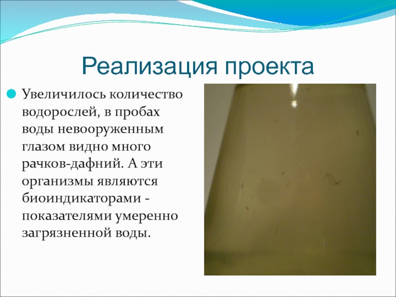 Реализация проектаУвеличилось количество водорослей, в пробах воды невооруженным глазом видно много рачков-дафний. А эти организмы являются
