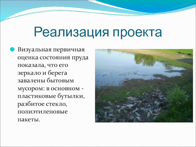 Реализация проектаВизуальная первичная оценка состояния пруда показала, что его зеркало и берега завалены бытовым мусором: в основном