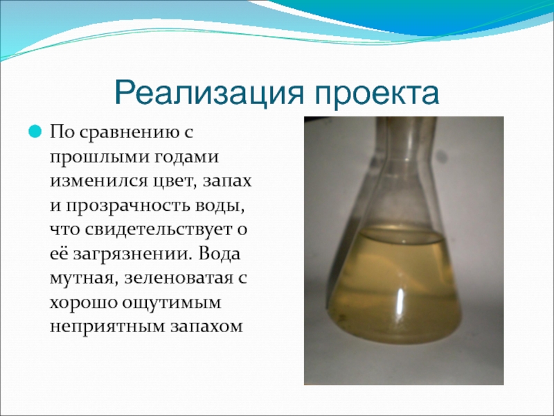 Реализация проектаПо сравнению с прошлыми годами изменился цвет, запах и прозрачность воды, что свидетельствует о её