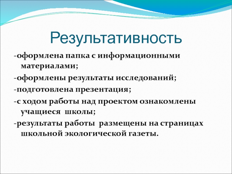 Результативность-оформлена папка с информационными материалами;-оформлены результаты исследований;-подготовлена презентация;-с ходом работы над проектом ознакомлены учащиеся школы;-результаты работы размещены