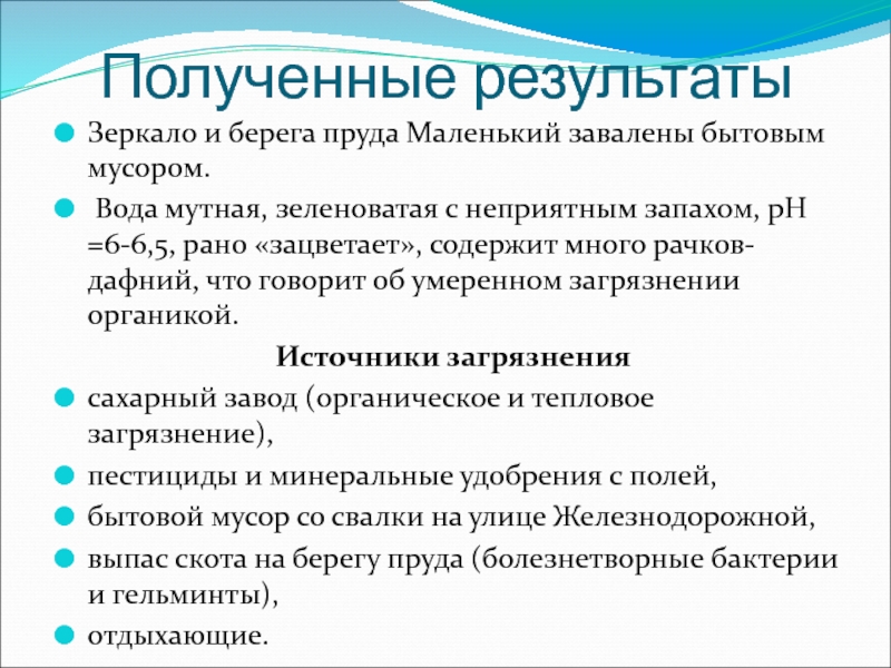 Полученные результатыЗеркало и берега пруда Маленький завалены бытовым мусором. Вода мутная, зеленоватая с неприятным запахом, рН =6-6,5,