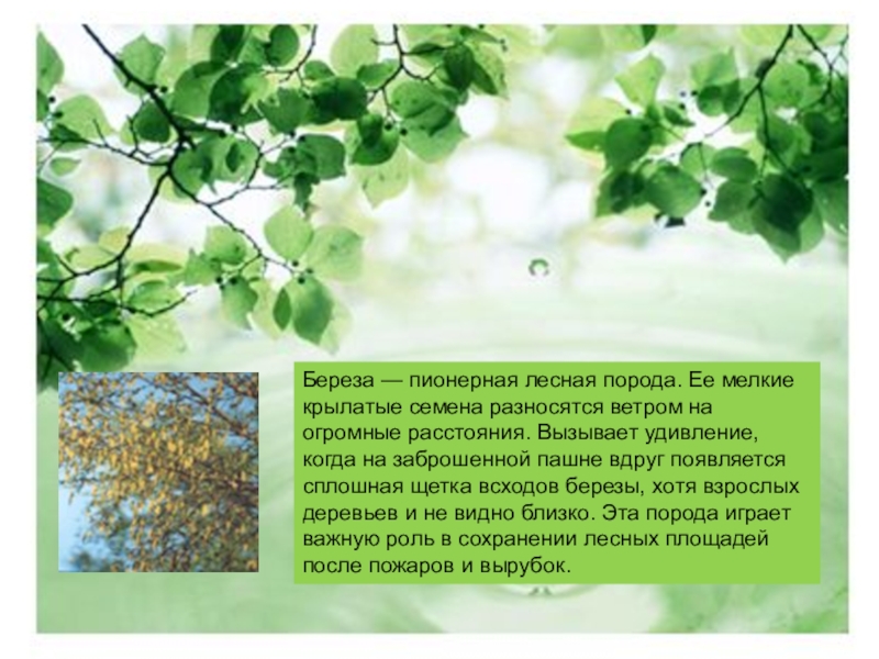 Береза — пионерная лесная порода. Ее мелкие крылатые семена разносятся ветром