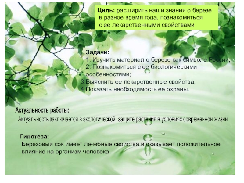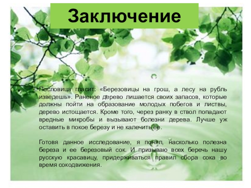 Готовя данное исследование, я понял, насколько полезна береза и ее березовый сок. И призываю всех беречь нашу русскую красавицу, придерживаться правил сбора сока во время сокодвижения.
