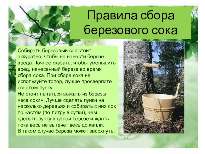 березе вреда. Точнее сказать, чтобы уменьшить вред, нанесенный березе во время сбора сока. При сборе сока не используйте топор, лучше просверлите сверлом лунку.