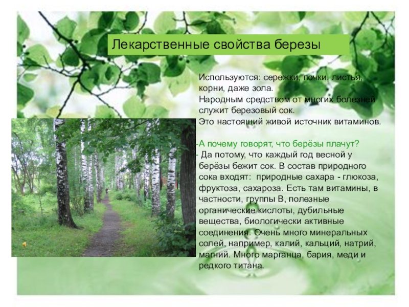 Да потому, что каждый год весной у берёзы бежит сок. В состав природного сока входят: природные сахара - глюкоза, фруктоза, сахароза. Есть там витамины, в частности, группы В, полезные органические кислоты, дубильные вещества, биологически активные соединения. Очень много минеральных солей, например, калий, кальций, натрий, магний. Много марганца, бария, меди и редкого титана.