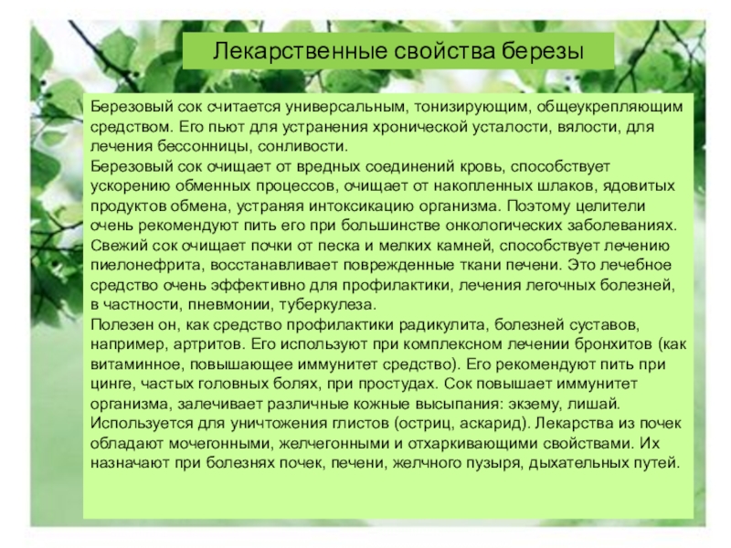 Березовый сок очищает от вредных соединений кровь, способствует ускорению обменных процессов, очищает от накопленных шлаков, ядовитых продуктов обмена, устраняя интоксикацию организма. Поэтому целители очень рекомендуют пить его при большинстве онкологических заболеваниях. Свежий сок очищает почки от песка и мелких камней, способствует лечению пиелонефрита, восстанавливает поврежденные ткани печени. Это лечебное средство очень эффективно для профилактики, лечения легочных болезней, в частности, пневмонии, туберкулеза.