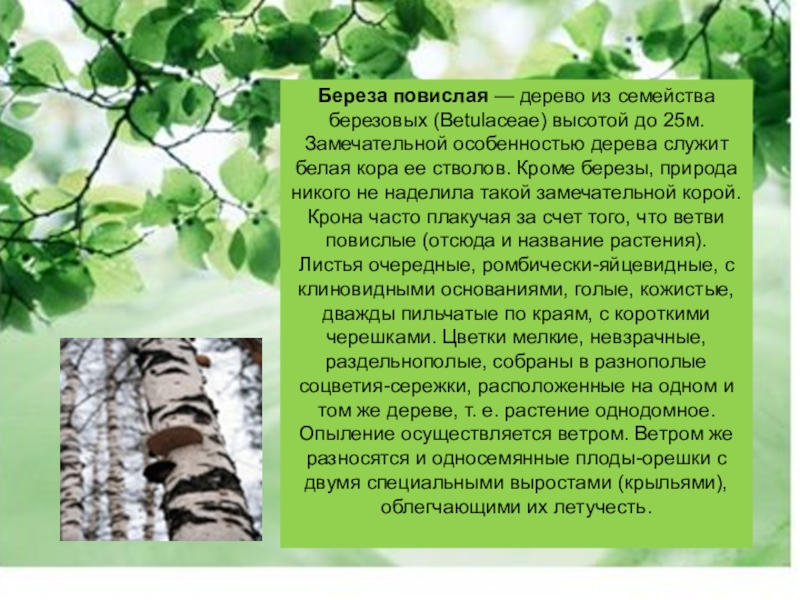 Береза повислая — дерево из семейства березовых (Betulaceae) высотой до 25м.