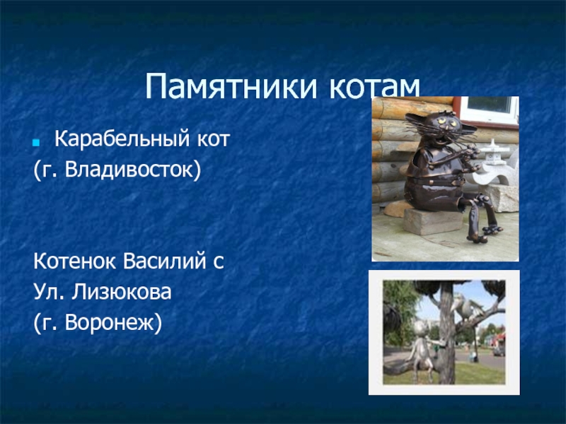 Памятники котамКарабельный кот (г. Владивосток)Котенок Василий с Ул. Лизюкова(г. Воронеж)