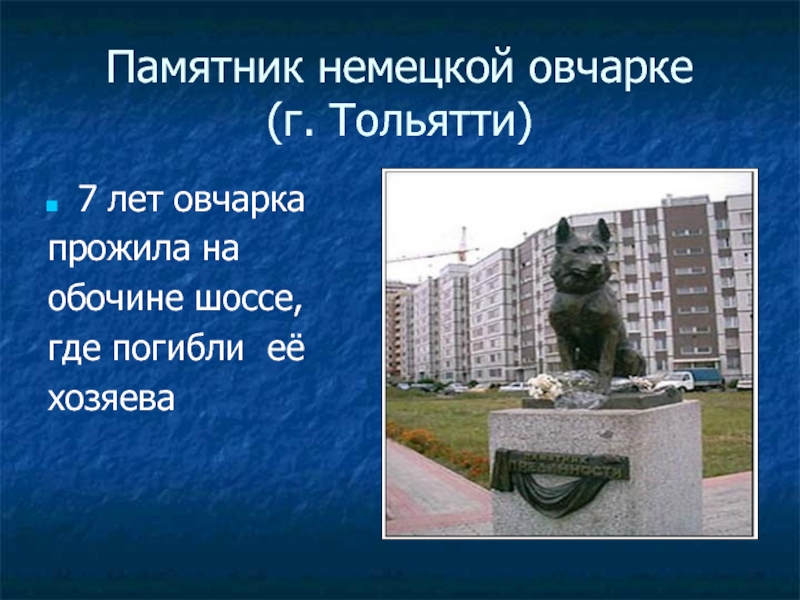 Памятник немецкой овчарке (г. Тольятти) 7 лет овчаркапрожила наобочине шоссе,где погибли еёхозяева