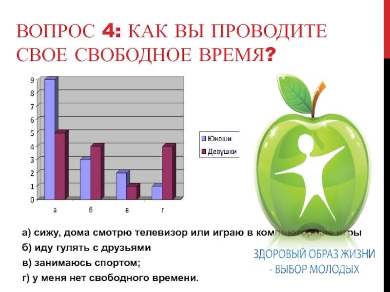 2) Большинство опрошенных подростков предпочитает проводить свободное время дома, а меньшинство опрошенных подростков проводят свободное время, гуляя с друзьями. Но самым печальным является то, что женская часть опрошенных не изъявляет желания заниматься спортом. Это говорит о том, что девушки и юноши имеют разные предпочтения в проведении свободного времени.