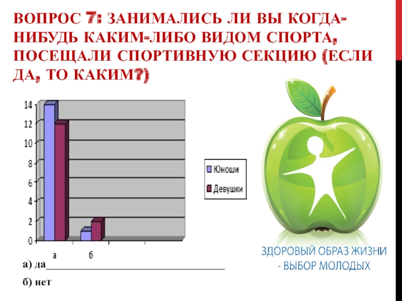 5) Большинство опрошенных подростков занимались различными видами спорта. Так же, нашлись и такие, которые не занимались спортом вообще.
