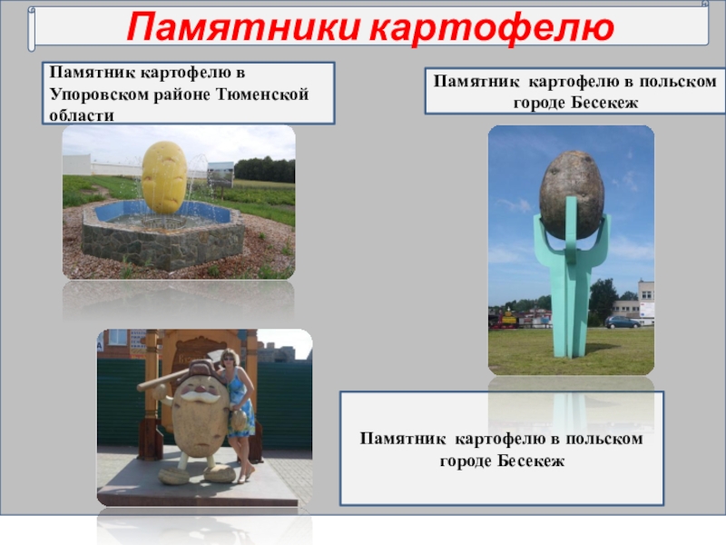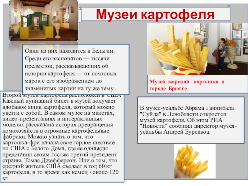 Один из них находится в Бельгии. Среди его экспонатов — тысячи предметов, рассказывающих об истории картофеля — от почтовых марок с его изображением до знаменитых картин на ту же тему .