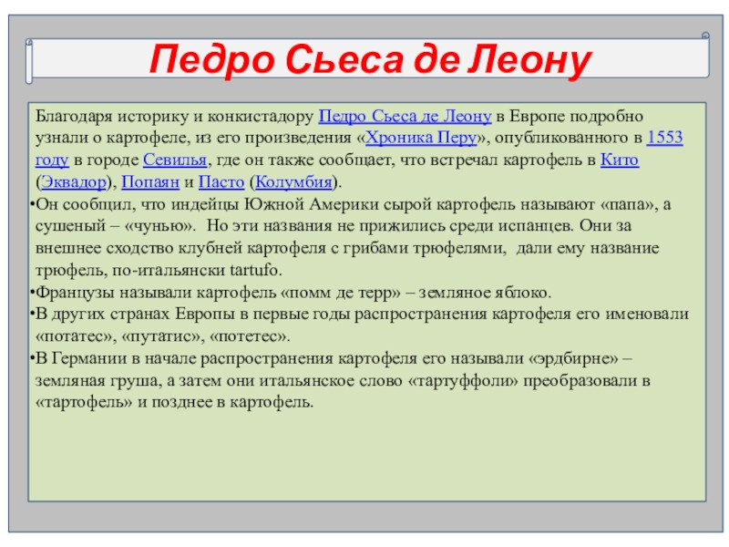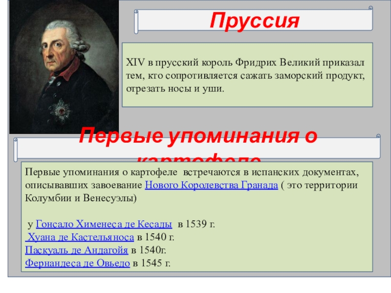 Первые упоминания о картофеле встречаются в испанских документах, описывавших завоевание Нового Королевства Гранада ( это территории Колумбии и Венесуэлы)