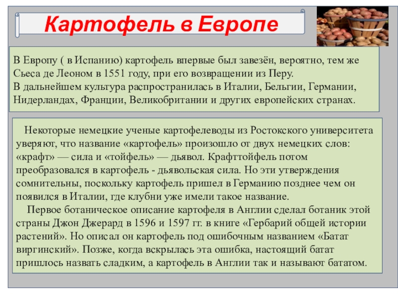 Первое ботаническое описание картофеля в Англии сделал ботаник этой страны Джон Джерард в 1596 и 1597 гг. в книге «Гербарий общей истории растений». Но описал он картофель под ошибочным названием «Батат виргинский». Позже, когда вскрылась эта ошибка, настоящий батат пришлось назвать сладким, а картофель в Англии так и называют бататом.