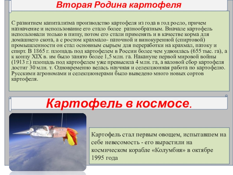 Картофель стал первым овощем, испытавшем на себе невесомость - его вырастили на космическом корабле «Колумбия» в октябре 1995 года