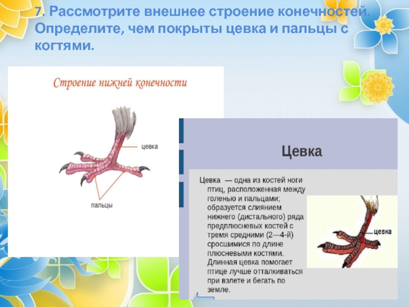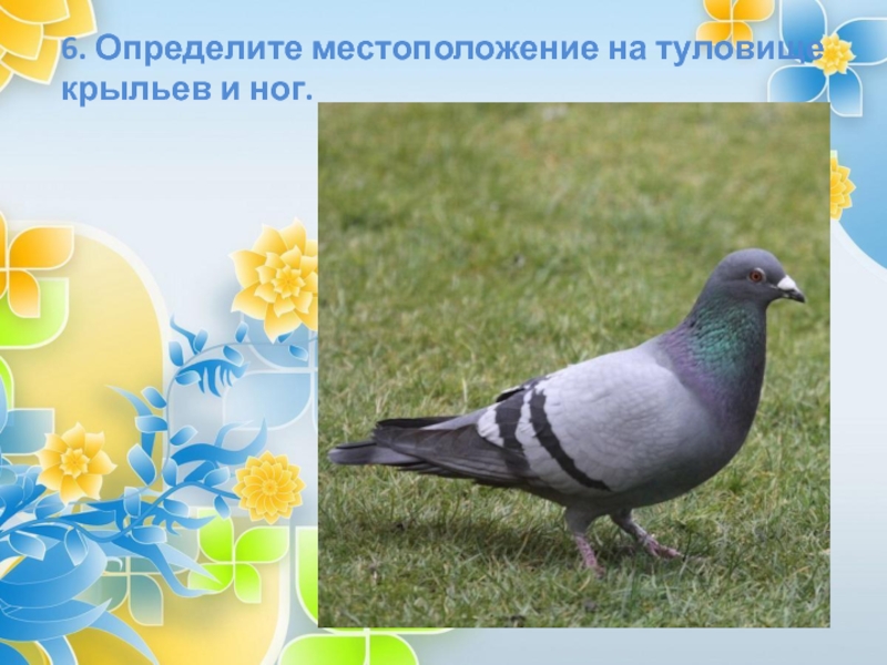 1. Найдите отделы птицы: голову, шею, туловище, хвост, крылья, ноги.