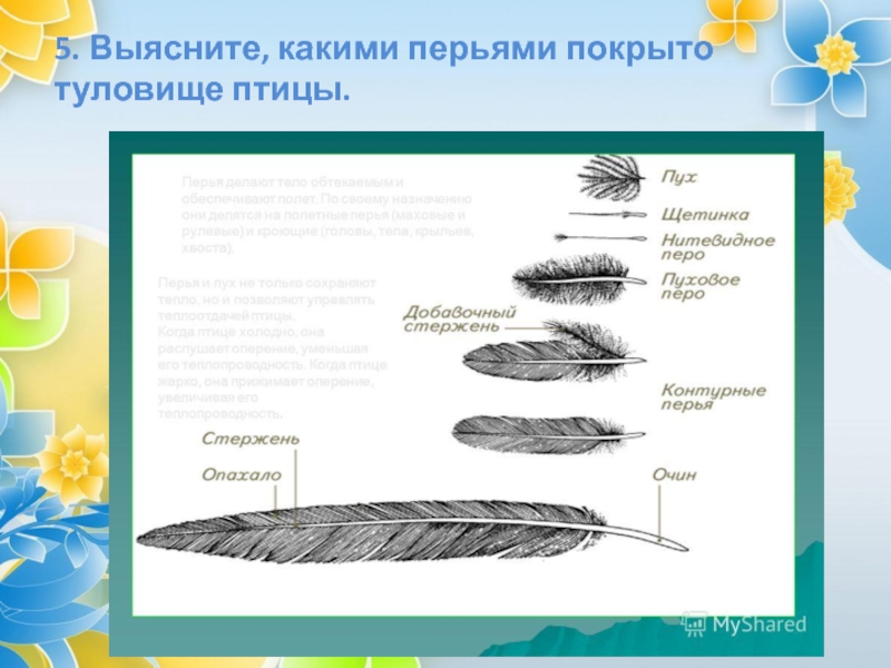 Оборудование и материалы: Чучело птицы, лупа, набор перьев (контурные, пуховые, пух)