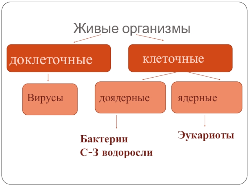Живые организмыдоклеточныеклеточныеВирусыдоядерныеядерныеБактерииС-З водорослиЭукариоты