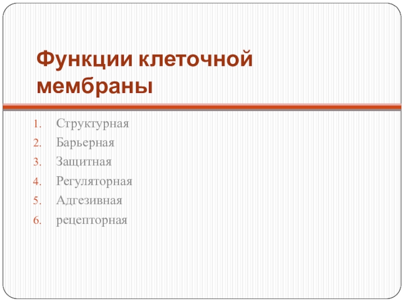Функции клеточной мембраныСтруктурная Барьерная ЗащитнаяРегуляторнаяАдгезивная рецепторная