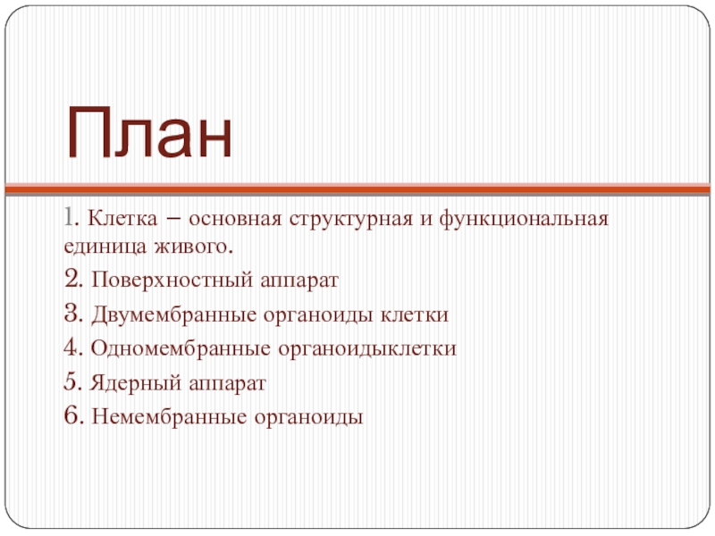 План1. Клетка – основная структурная и функциональная единица живого.2. Поверхностный аппарат3. Двумембранные органоиды клетки4. Одномембранные органоидыклетки5. Ядерный аппарат6. Немембранные органоиды