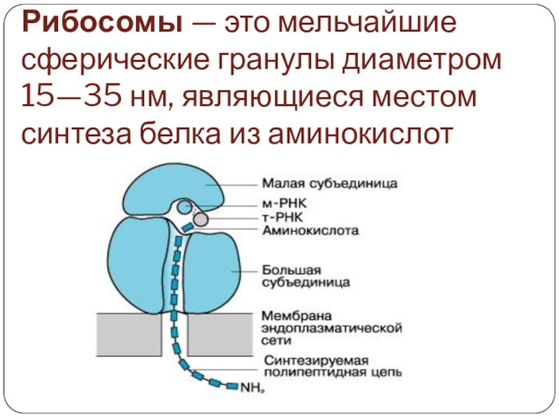 Слайд 20Рибосомы — это мельчайшие сферические гранулы диаметром 15—35 нм, являющиеся местом синтеза