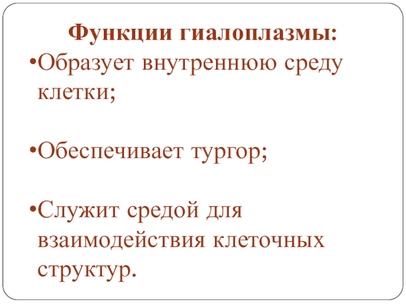 Функции гиалоплазмы:Образует внутреннюю среду клетки;Обеспечивает тургор;Служит средой для взаимодействия клеточных структур.