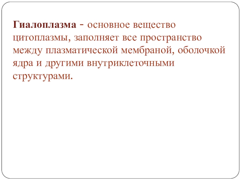 Слайд 7Гиалоплазма - основное вещество цитоплазмы, заполняет все пространство между плазматической мембраной,