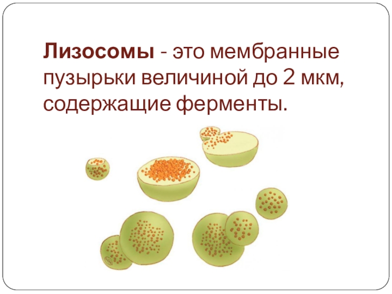 Слайд 16Лизосомы - это мембранные пузырьки величиной до 2 мкм, содержащие ферменты.