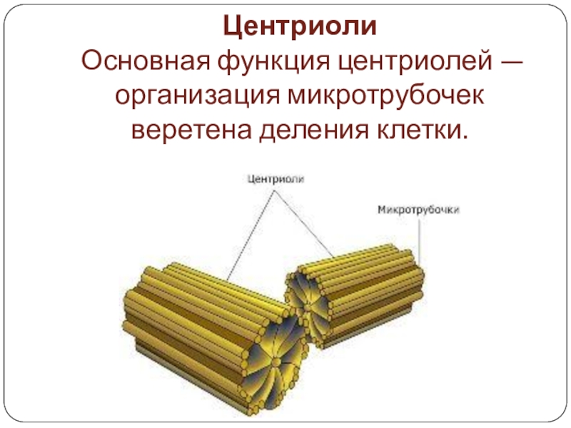 Центриоли   Основная функция центриолей — организация микротрубочек веретена деления клетки.Центриоли