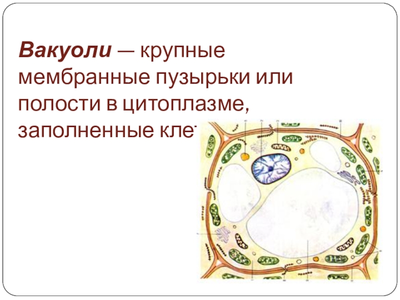 Слайд 17Вакуоли — крупные мембранные пузырьки или полости в цитоплазме, заполненные клеточным соком.