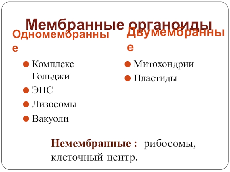 Мембранные органоидыОдномембранныеДвумембранныеКомплекс ГольджиЭПСЛизосомыВакуолиМитохондрииПластидыНемембранные : рибосомы, клеточный центр.