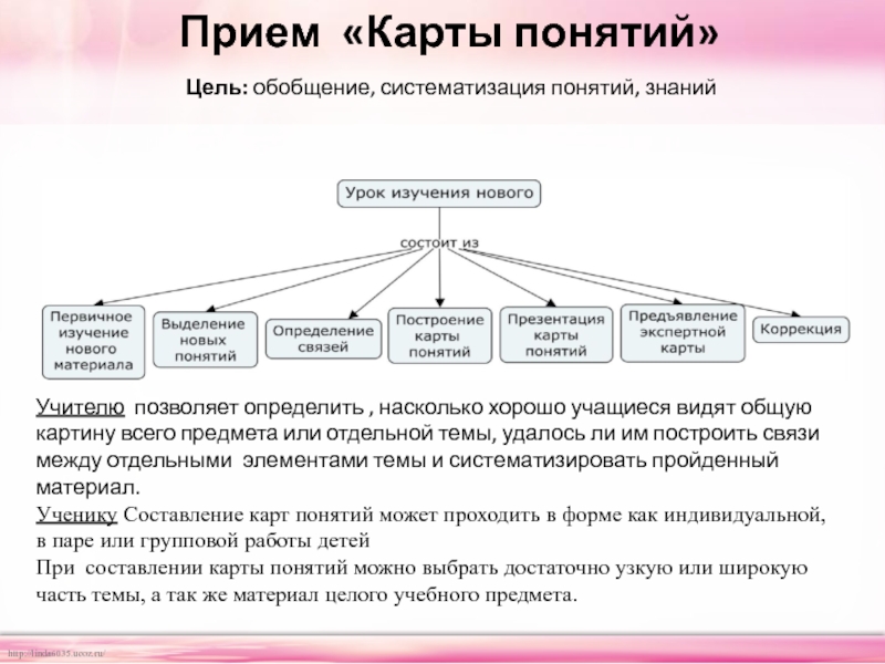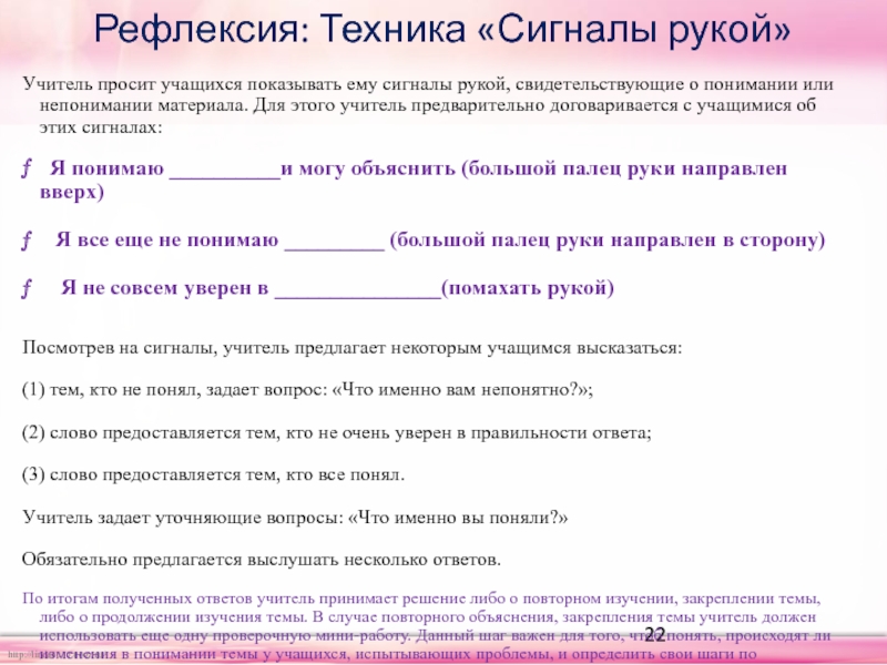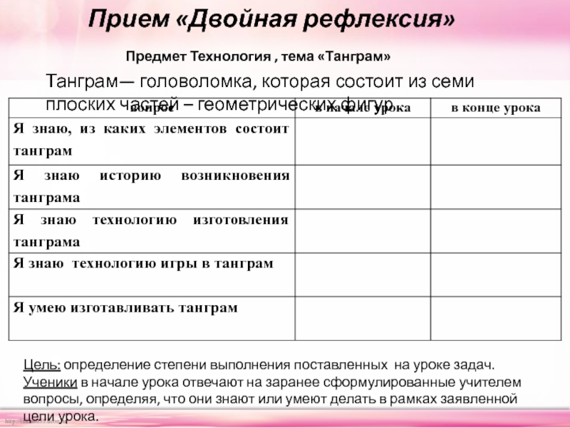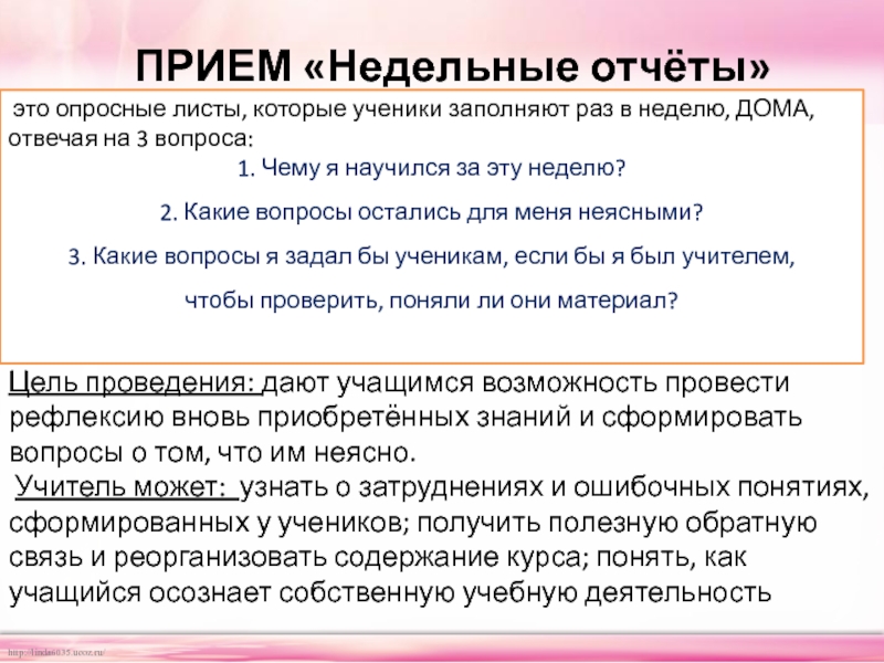 Цель проведения: дают учащимся возможность провести рефлексию вновь приобретённых знаний и сформировать вопросы о том, что им неясно.